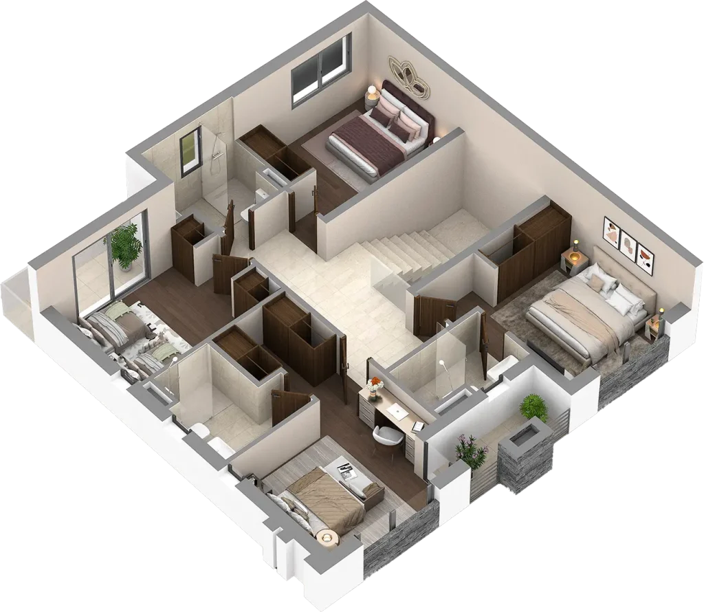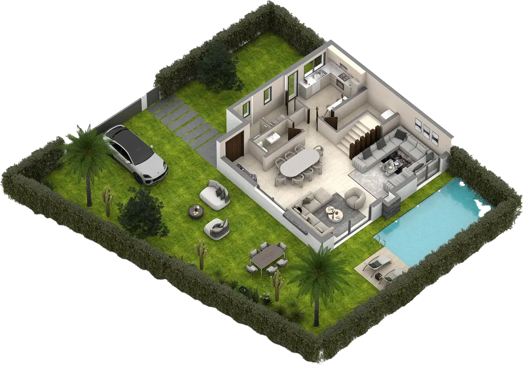 À l’étage, quatre chambres, dont une suite parentale et une suite junior, offrent un refuge intime pour accueillir toute la famille, en plus de deux salles de bains pour une praticité totale. Complétant ce cadre, un jardin soigneusement aménagé et une piscine privée s’adossent à chaque villa, articulant ainsi le raffinement et l’exclusivité du projet. Idéalement orientées, les villas de Bianca capturent à chaque instant la lumière naturelle, créant une atmosphère apaisante et propice à la détente.